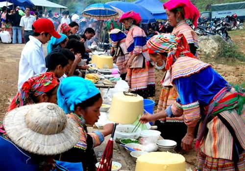 Khu vực ăn uống luôn đông vui. Ở hàng mía lúc nào cũng nườm nượp người mua kẻ bán, các cô gái cứ cầm cả cây mía dài và tước dần cho đến lóng cuối cùng, không cần dao róc. Kem cũng là một món khoái khẩu ở chợ phiên. Tại các hàng ăn, người bán hàng tay không ngớt xẻ thịt, trụng bánh phở, rót rượu, mời mọc khách... Bánh đúc ngô, thắng cố và phở có lẽ được ưa chuộng hơn cả. Dưới triền đồi thoai thoải là chợ gia súc, gia cầm với chủ yếu đàn ông tham gia mua bán.